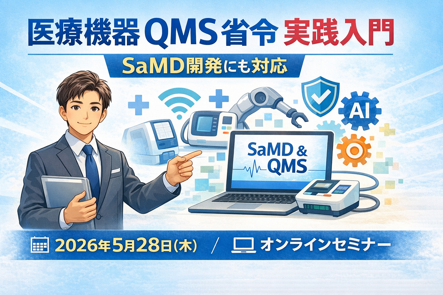 2026年5月28日(木)に、株式会社情報機構主催のオンラインセミナー 「医療機器QMS省令 実践入門:SaMD開発にも対応」 に、当機構代表理事の百武裕昭が講師として登壇いたします。