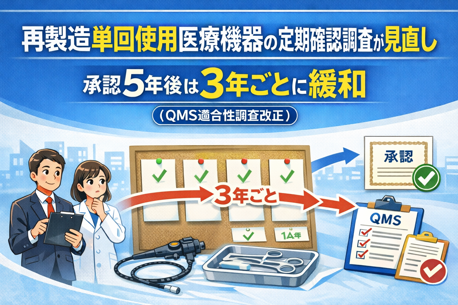 令和7年7月8日付けで、厚生労働省医薬局は「基準適合証及びQMS適合性調査申請等の取扱いについて」の一部改正を通知しました。本改正は、再製造単回使用医療機器の製造販売承認の条件として付された定期確認調査について、調査頻度等の見直しを行ったものです。承認取得から5年経過後は3年を超過しない期間ごとの調査へと緩和され、実績を持つ製造販売業者の負担軽減が図られます。