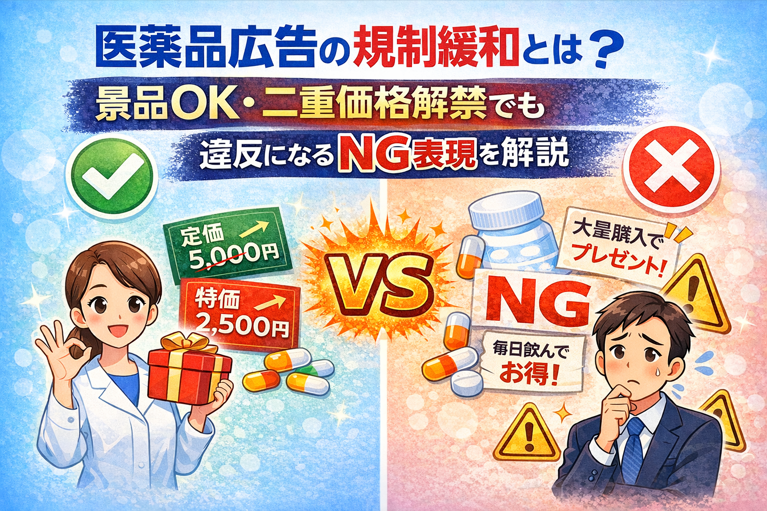 医薬品等の広告に関しては、保健衛生上の危害防止や安全性確保の観点から、薬事法および関連通知に基づく監視指導が行われてきました。 特に価格表示については、「二重価格表示」や「大廉売」等の表現が禁止等の指導対象とされてきた経緯があります。 「二重価格表示」とは参考上代価格と実売価格を並記して割引感を演出する手法、「大廉売」とは大幅な値引きを強調する広告手法を指します。 これらが医薬品の品位を傷つけ乱用を助長するとして規制されてきました。